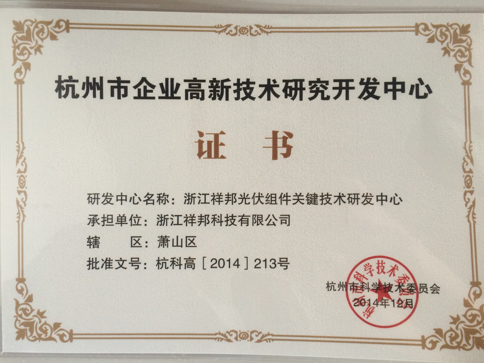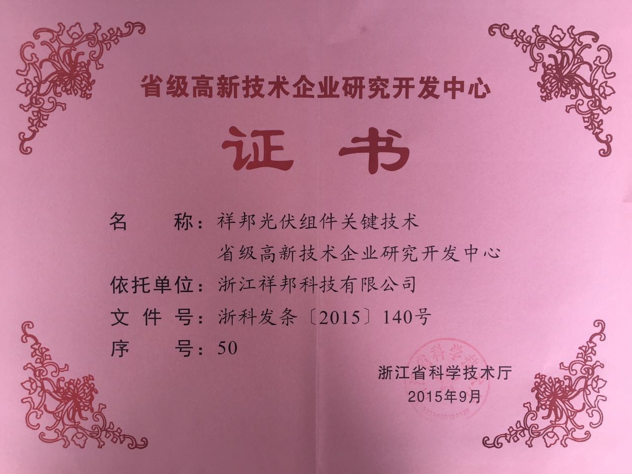 祥邦光伏組件關(guān)鍵技術(shù)省級高新技術(shù)企業(yè)研究開發(fā)中心